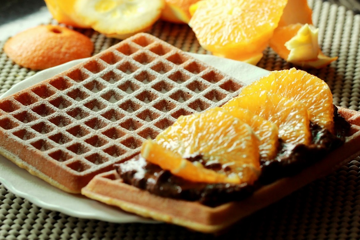 Wszystkie składniki dokładnie wymieszaj. Rozgrzej gofrownicę i nakładaj porcje ciasta. Piecz gofry na złoty kolor. Po upieczeniu na wierzch poukładaj ulubione, świeże owoce. Ja użyłam czekoladowej "nutelli" z awokado i świeżą pomarańczę.