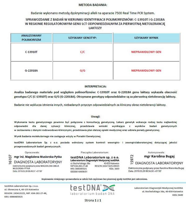Nietolerancja laktozy może mieć charakter pierwotny (uwarunkowany genetycznie) jak i wtórny (może powstać pod wpływem uszkodzenia struktury błony śluzowej jelit np. w przebiegu celiakii). Nietolerancję laktozy można sprawdzić wykonując wodorowy test oddechowy. Polega on na przyjęciu zalecanej dawki laktozy, a następnie na pomiarze stężenia wodoru z wydychanego przez pacjenta powietrzu. Można również wykonać badanie genetyczne, które określi czy nietolerancja laktozy jest pierwotna. Jest to jedyne badanie różnicujące czy nietolerancja laktozy jest wtórna, czy jest pierwotna i ma charakter stały. Dla przykładu załączam zdjęcie wyniku badania pacjentki z chorobą Hashimoto, która pomimo nietolerancji laktozy przez parę lat była leczona Euthyroxem, który jak wiadomo w swoim składzie ma laktozę. Czy w przypadku tej pacjentki diagnostyka była warta wykonania? – Zdecydowanie tak!