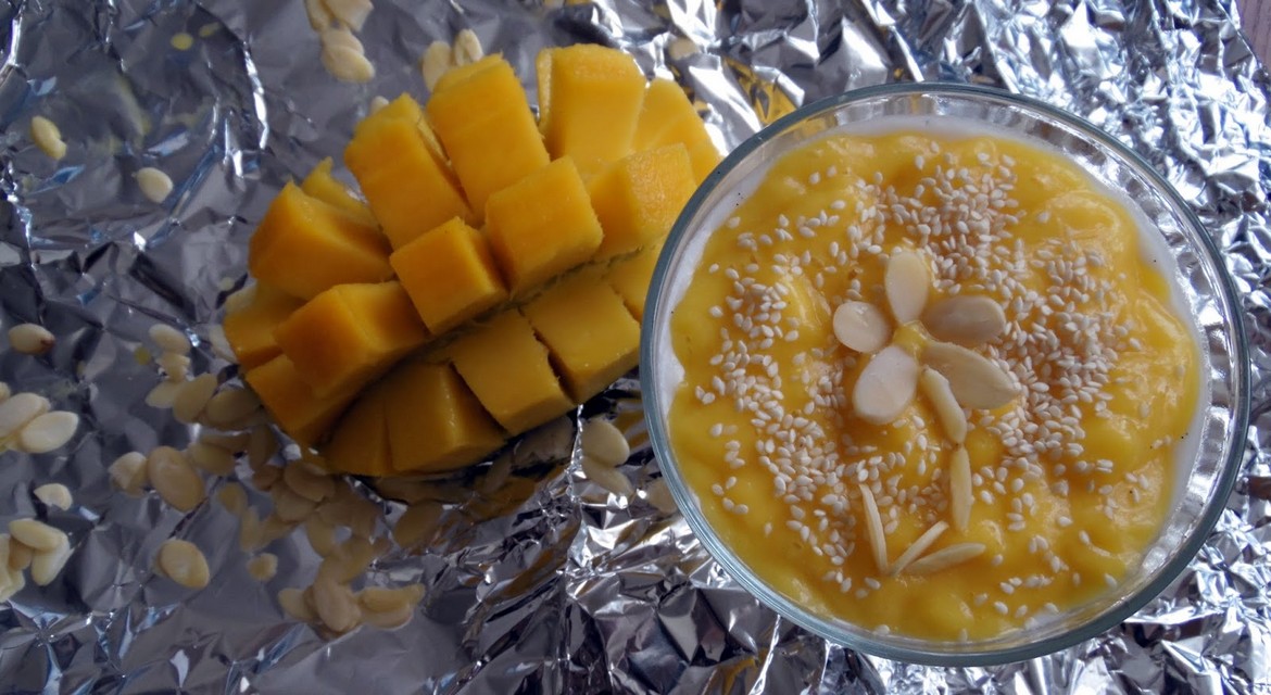 Gdy mleko kokosowe z nasionami zagotuje się, odstaw garnek na bok, aby troszkę się schłodził i dodaj odrobinę słodyczy w postaci stewii/miodu. Na koniec rozlej wszystko na salaterki (w tym przypadku 2) a na wierzch wylej mus z mango.