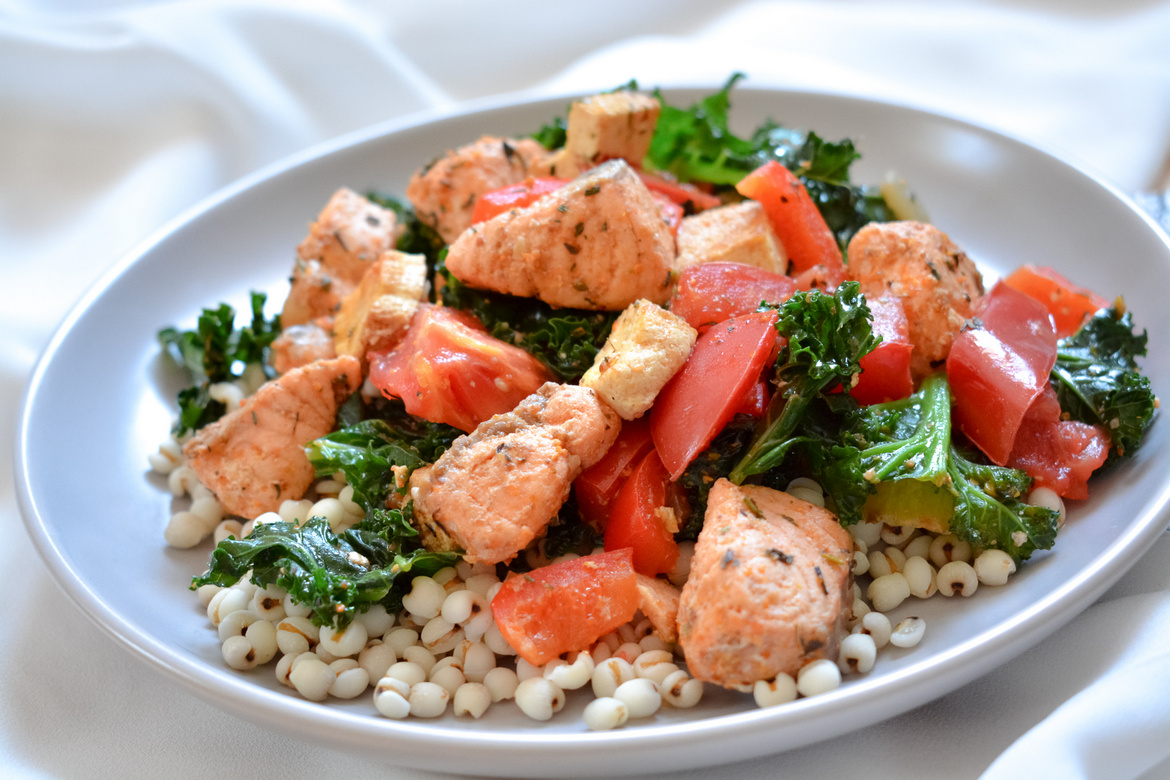 Łosoś z letnimi warzywami i kaszą coix