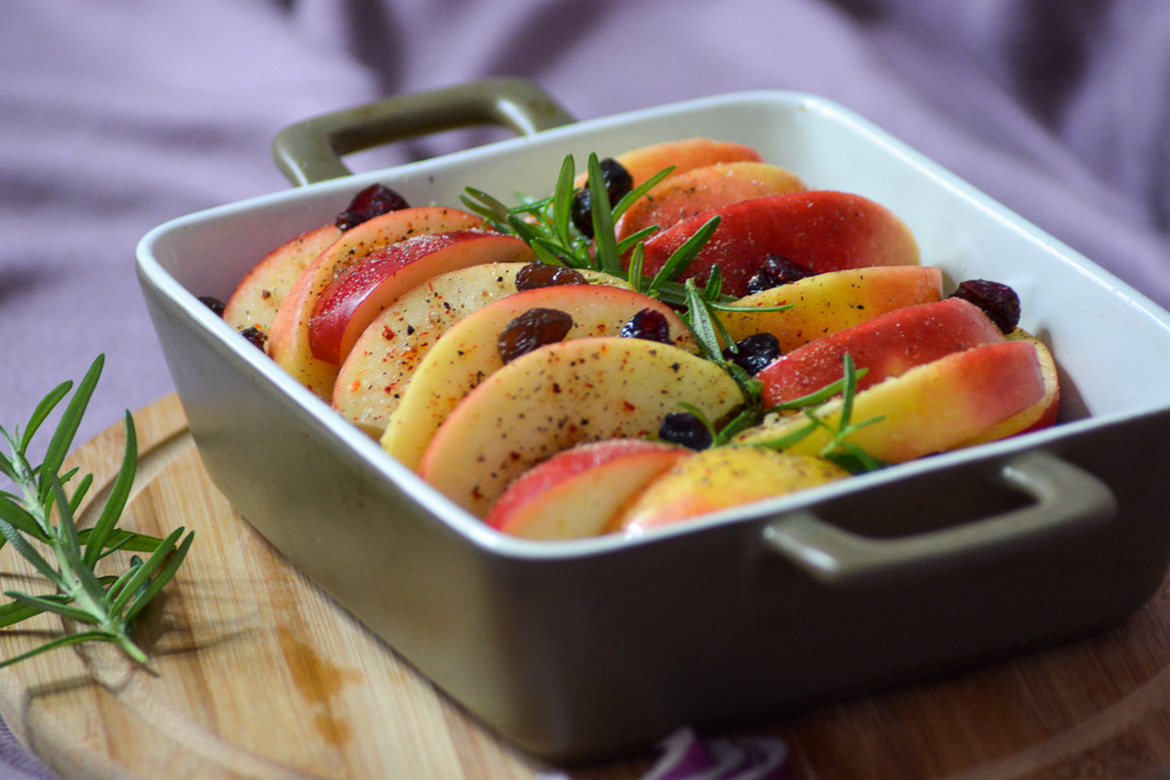 Poszukujecie pomysłu na szybki, pyszny i dobrze prezentujący się obiad? Co powiecie na pieczoną pierś z kurczaka pod warstwą świeżych jabłek i żurawiny? Danie wykonuje się dosłownie w parę chwil, a jego smak balansuje pomiędzy ostrością płatków chili i słodkością jabłek oraz żurawiny. Koniecznie spróbujcie i dajcie znać jak smakowała Wam pieczona pierś z kurczaka z jabłkami i żurawiną. Możecie ją podawać w towarzystwie ulubionej kaszy (u mnie gryczana) i świeżej sałaty. Jestem pewna, że podczas świątecznego obiadu pieczeń zachwyci nie jedno podniebienie! Smacznego!