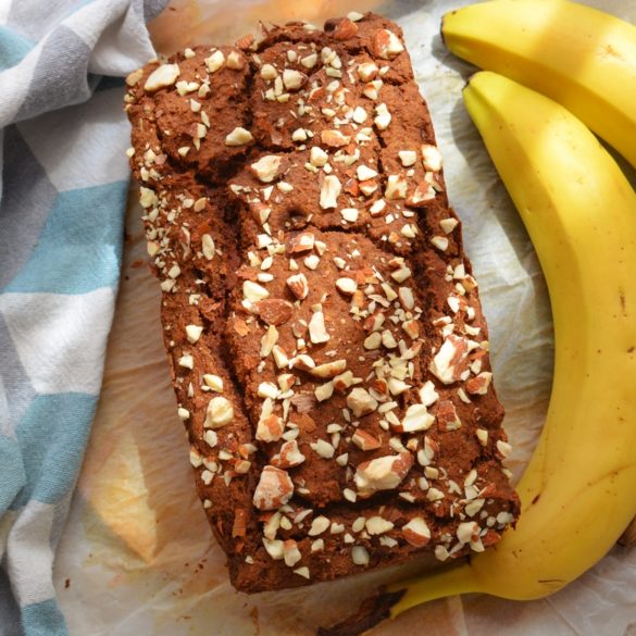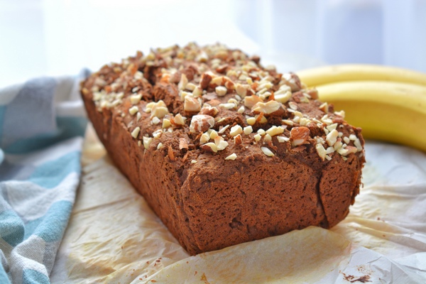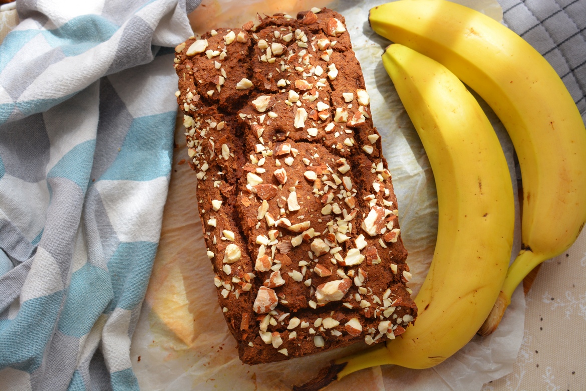 Banany oddziel od skórek i za pomocą widelca rozgnieć na gęstą masę. W większej misce wymieszaj składniki mokre z suchymi. W razie potrzeby dodaj do smaku ulubione, słodkie przyprawy korzenne. Dokładnie wszystko wymieszaj. Przygotuj blaszkę i wyłóż ją papierem do pieczenia. Wlej masę i piecz w 180’C przez ok 50 min. Użyłam blaszki o wymiarach: 12cm/21cm. Wierzch posyp pokruszonymi migdałami.