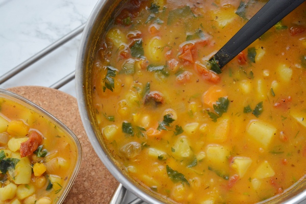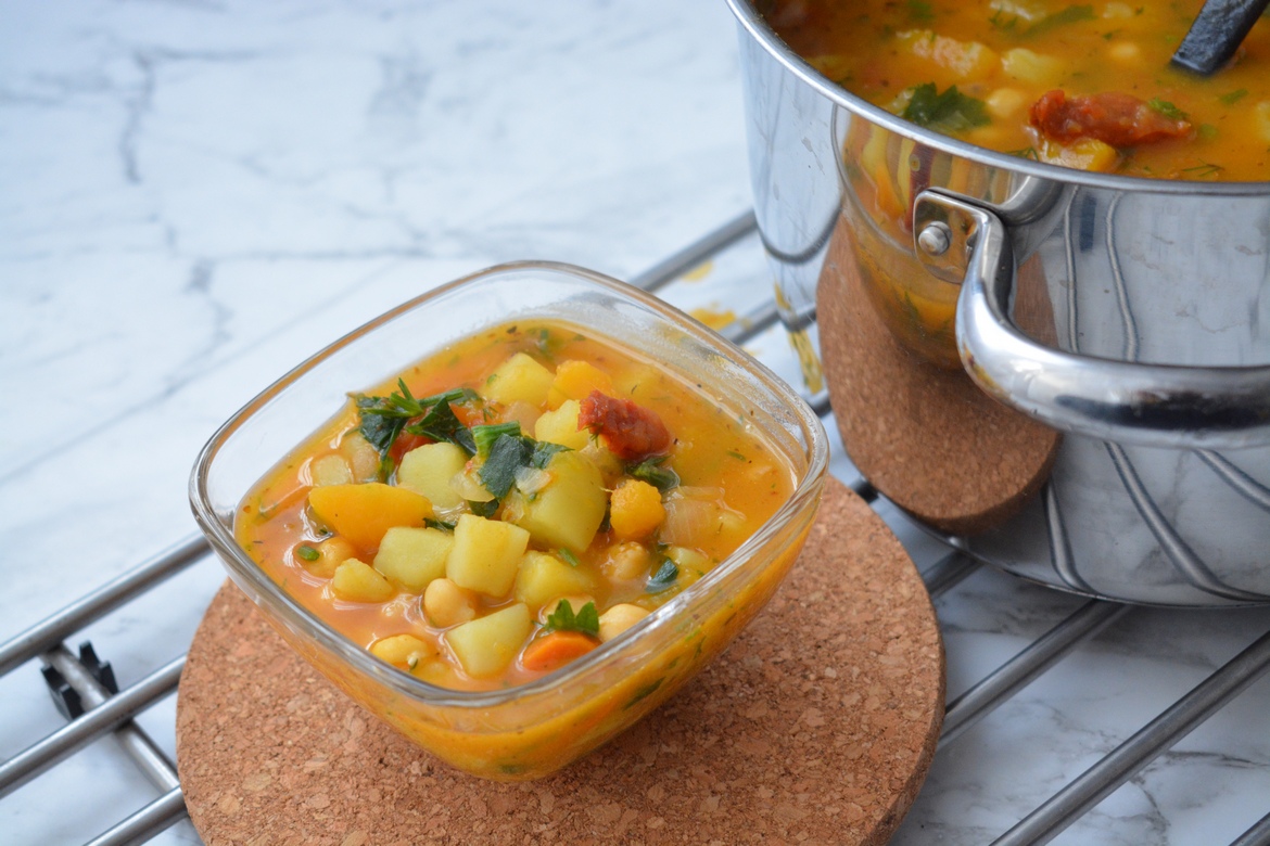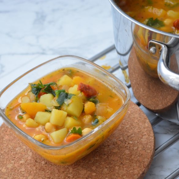 Najlepiej dzień wcześniej namocz ciecierzycę, minimalnie przez noc. Następnie ugotuj w większym garnku. W międzyczasie umyj i oczyść warzywa. Cebulkę drobno posiekaj, suszone pomidorki pokrój w paseczek. Czosnek posiekaj. Ziemniaki i dynię pokrój w dużą kostkę. Do gotującej się ciecierzycy dodaj posiekane ziemniaczki i dynię. Gotuj pod przykryciem. W międzyczasie podsmaż na oliwie cebulkę, czosnek i pomidorki z kaparami. Dodaj do cebulki przygotowane przyprawy. Podsmażaj przez chwilę. Następnie dodaj do gotującej się wody. Gotuj ok 40 minut. Posiekaj natkę selera i koperku. Przygotowaną zieleninę wrzuć przed końcem gotowania się do zupy. Gotuj do momentu, aż dynia będzie bardzo miękka. W razie potrzeby dodaj według smaku soli i pieprzu.